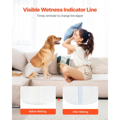 Wetness Indicator: Our VEVOR disposable dog diapers feature an intuitive wetness indicator that clearly shows the status before and after wetting. When dry, the line remains normal, but when wet, it changes instantly, letting you know it's time for a change to keep your pet dry and comfortable.
