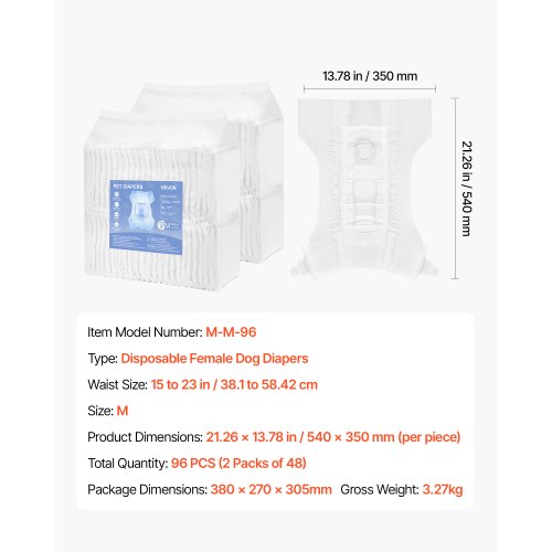 Super Absorbent: VEVOR disposable dog diapers in M size have a super absorbent core that quickly locks in liquid and offers 360° leak-proof protection without backflow. Perfect for dogs in running cycles, dog training, incontinence, post-surgery recovery and travel. Suitable waist size: 15-23 inches / 38.1 - 58.42 cm