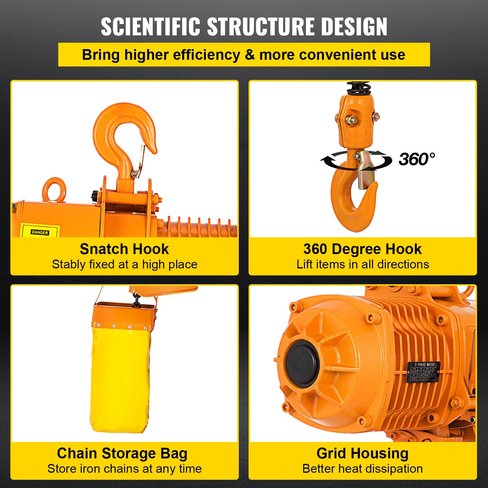 Robust Motor & Durable Shell: Power: 1.1KW. Our electric chain hoist has single-phase copper motor and aluminum shell, durable, rust-proof and corrosion-resistant. Special heat sink ensures fast cooling and high working efficiency.