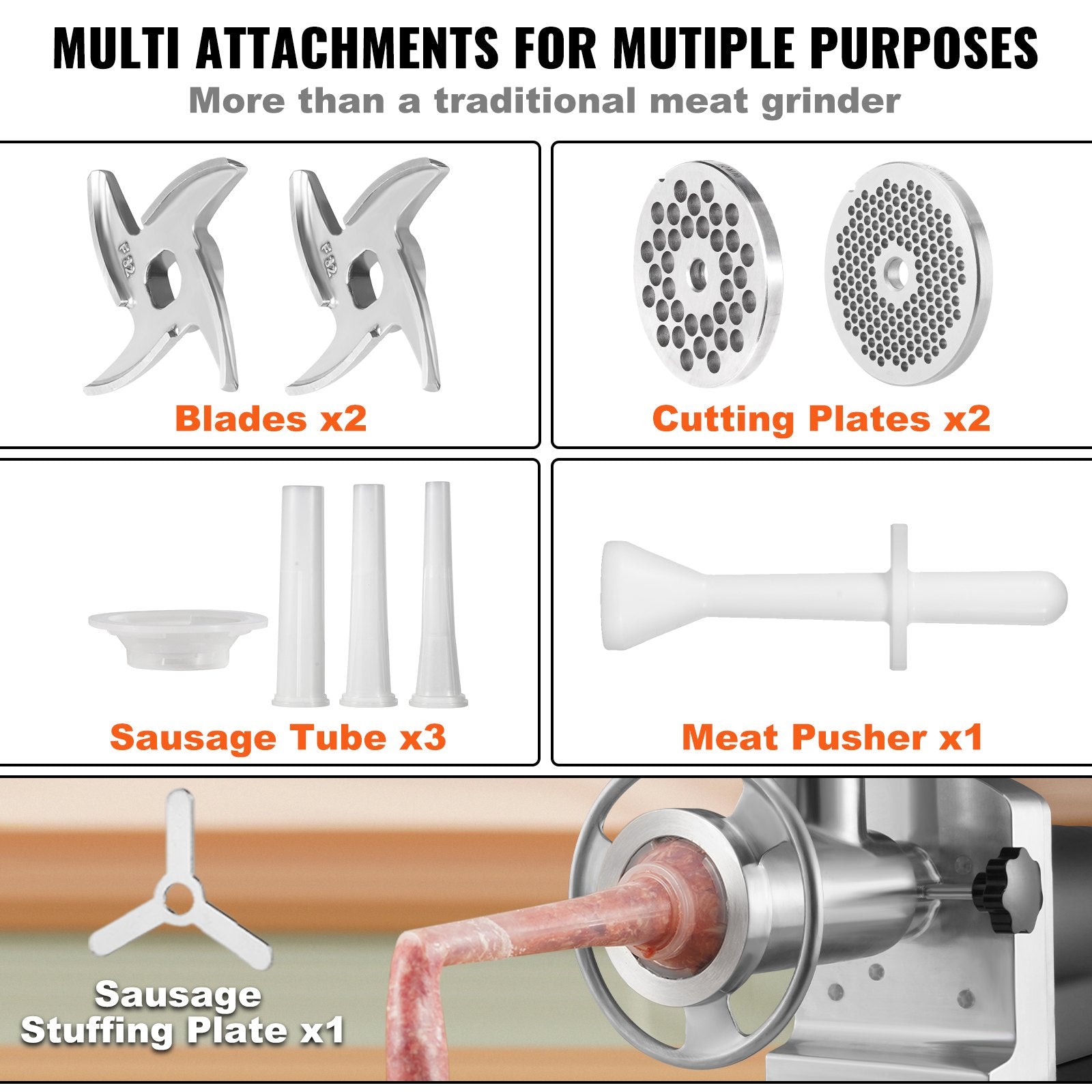 Bonus accessories: This classic meat grinder includes: Two 420 stainless steel blades, two different sized cutting plates (4.5/10 mm) for coarse and fine grinding of meat, a sausage stuffing plate, three different sized sausage tubes, a cube set and a cleaning brush.