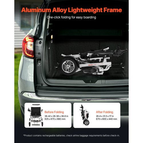 One-touch folding: Easily fold the electric folding wheelchair using a push-button system. Compact and lightweight, perfect for travel, making it easy to transport and store for trips to hospitals, airports, and more.