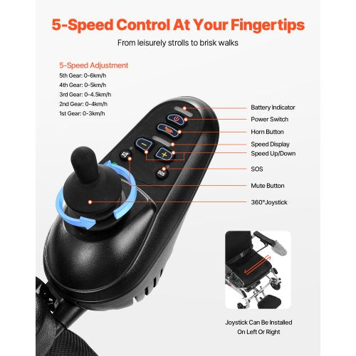 5-speed adjustment: Easily control the speed with one-handed operation. The joystick is reversible and features 5-speed adjustment, battery indicator, power switch, horn and speed display, providing ultimate convenience.