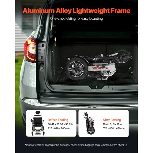 One-touch folding: Easily fold the electric folding wheelchair using a push-button system. Compact and lightweight, perfect for travel, making it easy to transport and store for trips to hospitals, airports, and more.