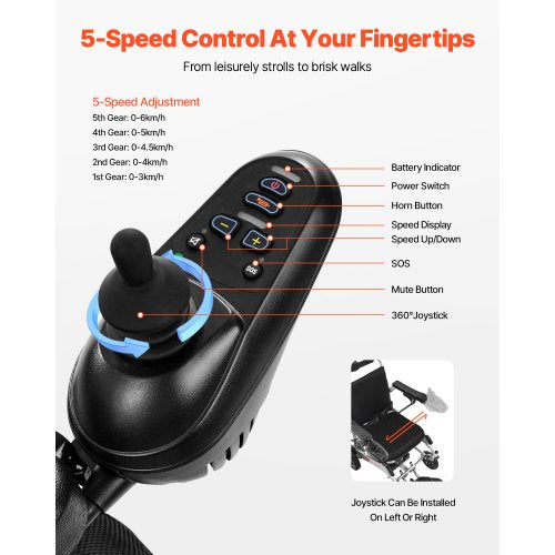 5-speed adjustment: Easily control the speed with one-handed operation. The joystick is reversible and features 5-speed adjustment, battery indicator, power switch, horn and speed display, providing ultimate convenience.