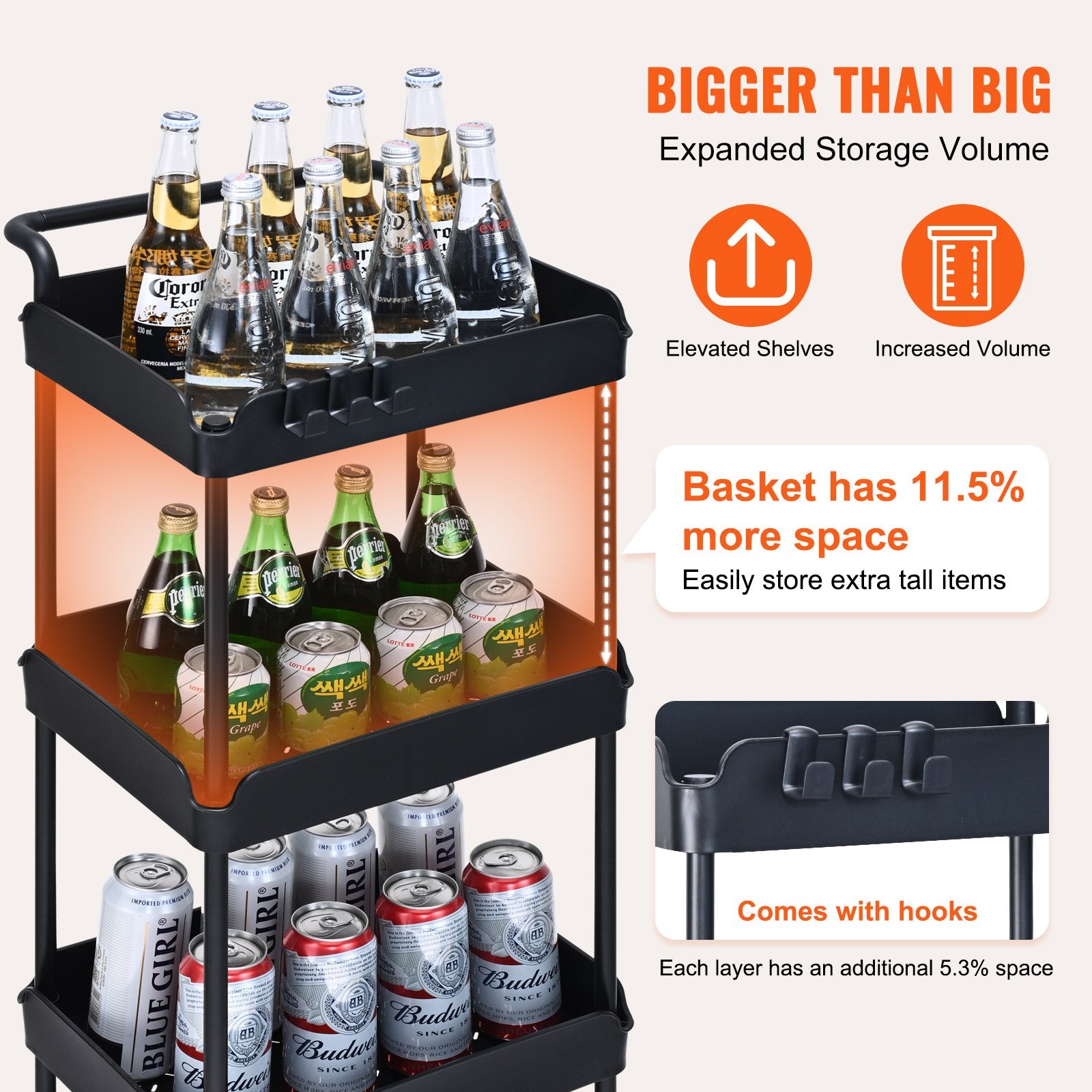 Increased Capacity: Experience expanded storage space with our newly upgraded rolling cart! With an increase in height, each shelf provides 5.3% more space with 11.5% more basket space. Whether it's bulky items or small knick-knacks, you can store them all. Plus, extra hooks mean more hanging space – talk about convenience!