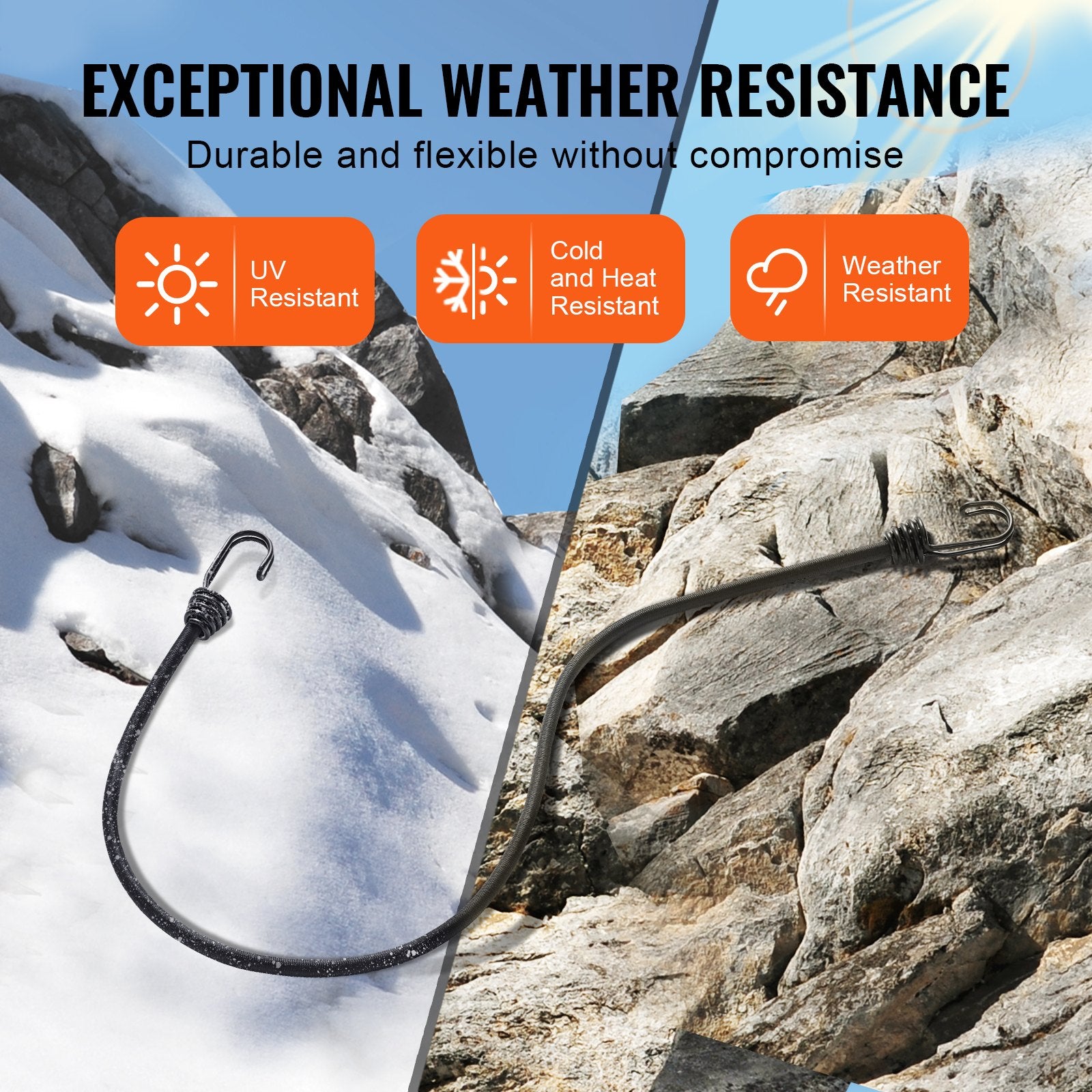 Durability: Outstanding weather resistance ensures that these heavy-duty bungee cords maintain stable performance in extreme conditions, whether it's high heat, freezing temperatures, humidity or dryness, without aging or breaking easily.