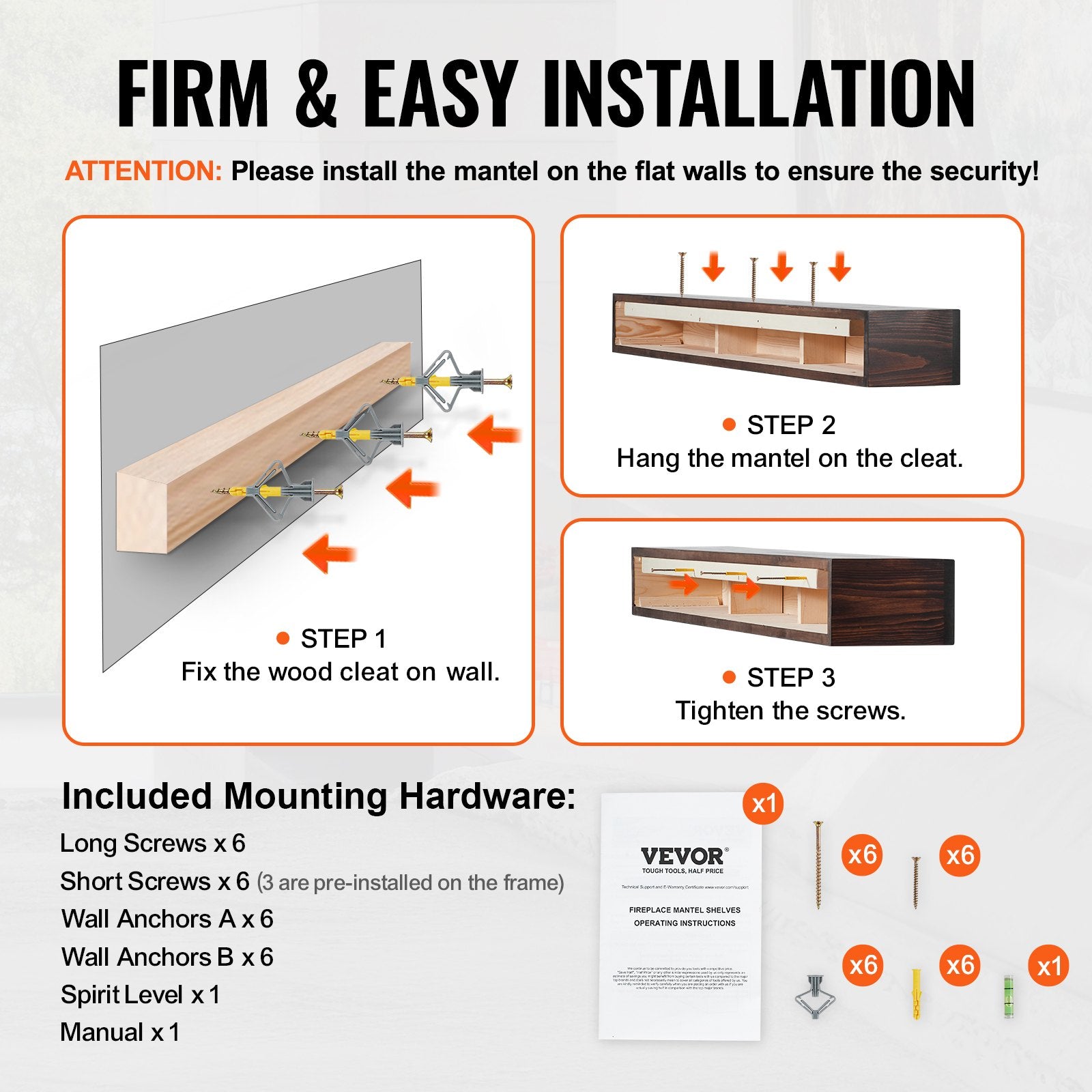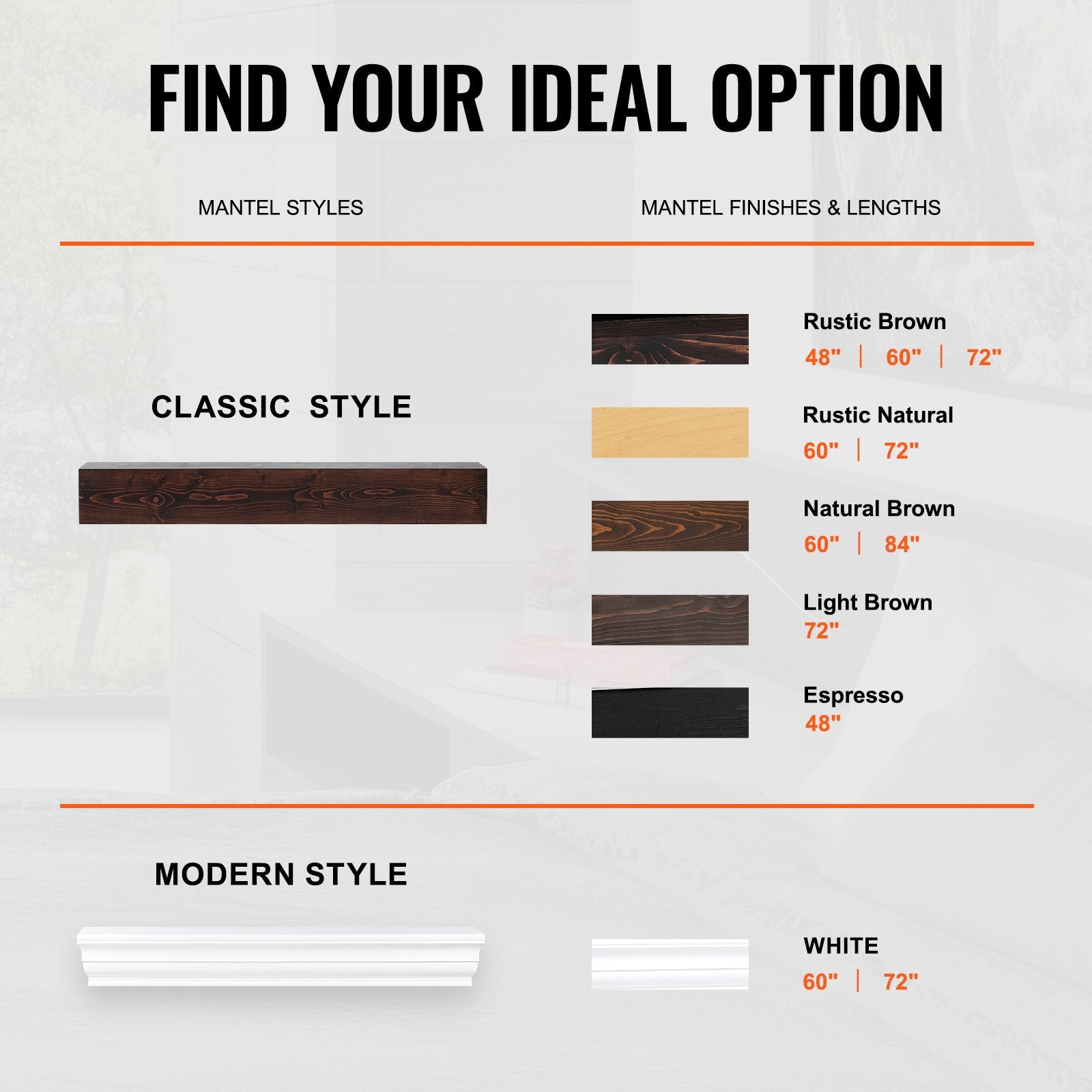 Know Your Mantel: This floating mantel shelf comes in a rustic brown color and measures 60 inches in length. With a weight capacity of 50 lbs, it's sturdy enough to display your favorite decorations, from family photos to cherished keepsakes.