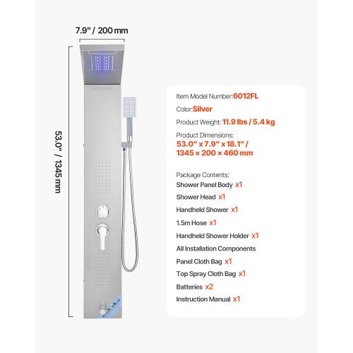 5-in-1 Shower System: This shower panel system covers rainwater, waterfall, 2 body spray areas that cover the whole body, tub spout and handheld shower head. It meets various needs, from quick rinsing to deep relaxation.