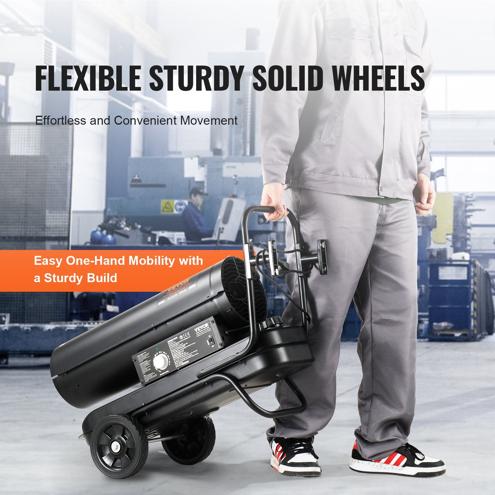 Heating for Wide Work Areas: This forced air kerosene heater delivers 70,000 BTU of heat and instantly heats spaces like your work area, barn, workshop, yard or indoor areas up to 14126 cu.ft / 400 m³. It ensures efficient equipment operation and working comfort.