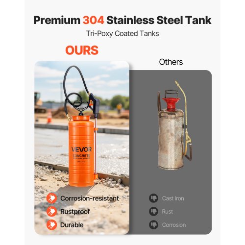 Premiummaterial för hållbarhet: Tillverkad med en tank av tri-poxy rostfritt stål, 2 mässingsmunstycken och fluorgummitätningar, erbjuder denna betongspruta utmärkt rost-, korrosions- och bucklemotstånd, vilket säkerställer långvarig och stabil drift. Obs: Rengör omedelbart efter användning för att bibehålla prestandan.