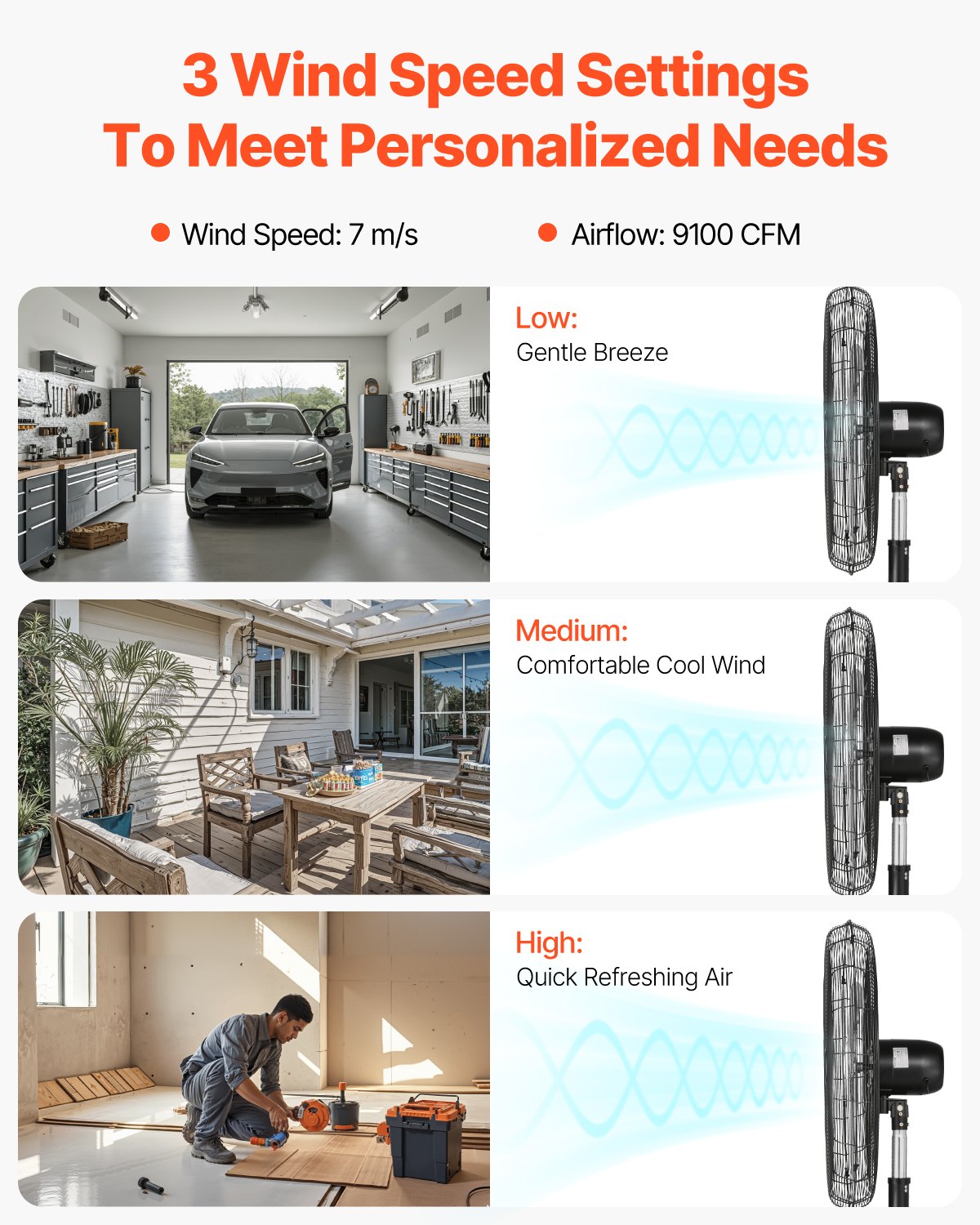 3-Speed Adjustable: This standing fan offers 3 adjustable speed settings, so you can tailor the airflow for sleeping, relaxing, or indoor activities. With a powerful 9100 CFM airflow and a wind speed of 7 m/s, you will stay cool and fresh