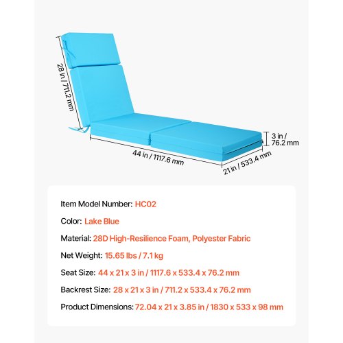 Universal Fit: This set of 2 outdoor lounge cushions has a seat size of 44 x 21 x 3 inches / 1117.6 x 533.4 x 76.2 mm and a back size of 28 × 21 × 3 inches / 711.2 × 533.4 × 76.2 mm, designed to fit most standard lounge chairs. It offers full body support and lasting comfort. For optimal fit, please measure your chair before purchase.