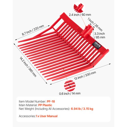 Package includes: This set includes 6 horse manure fork heads, each measuring approximately 400 x 310 x 95 mm, with a hole diameter of 2.5 cm. Note: Please check the size of the fork head before purchasing the handle.