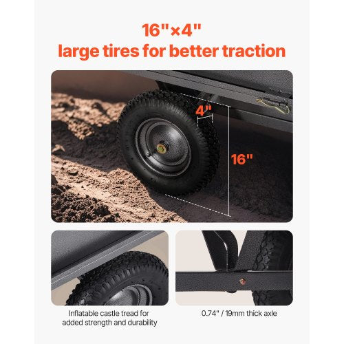 Adaptable to Rough Terrain: With large 16"×4" air-filled tires, this lawn mower trailer offers excellent grip and strength. It ensures smooth movement over uneven surfaces such as grass, mud, sand and gravel, with a thickened powder-coated axle for durability.