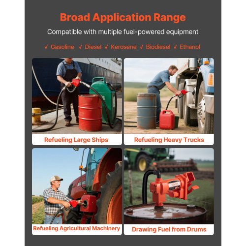 Bred dieselkompatibilitet: Utformad för bensin, diesel, fotogen och biodiesel. Denna dieselbränsleöverföringspump stöder olika dieseldrivna utrustningar som lastbilar, grävmaskiner, traktorer, jordbruksmaskiner, generatorer med mera.