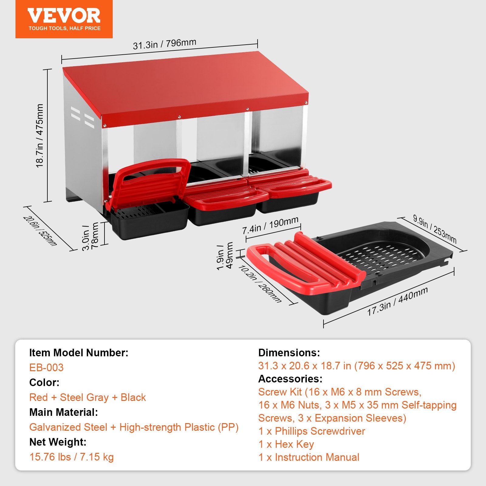 Easy to install: Assembled with screws, nuts and other accessories, any person can easily install the egg laying box, making the installation easy to complete. It saves a lot of time and labor costs. Its convenient design makes it easy to collect eggs and prevents eggs from breaking. Enjoy a simple and convenient farming time!