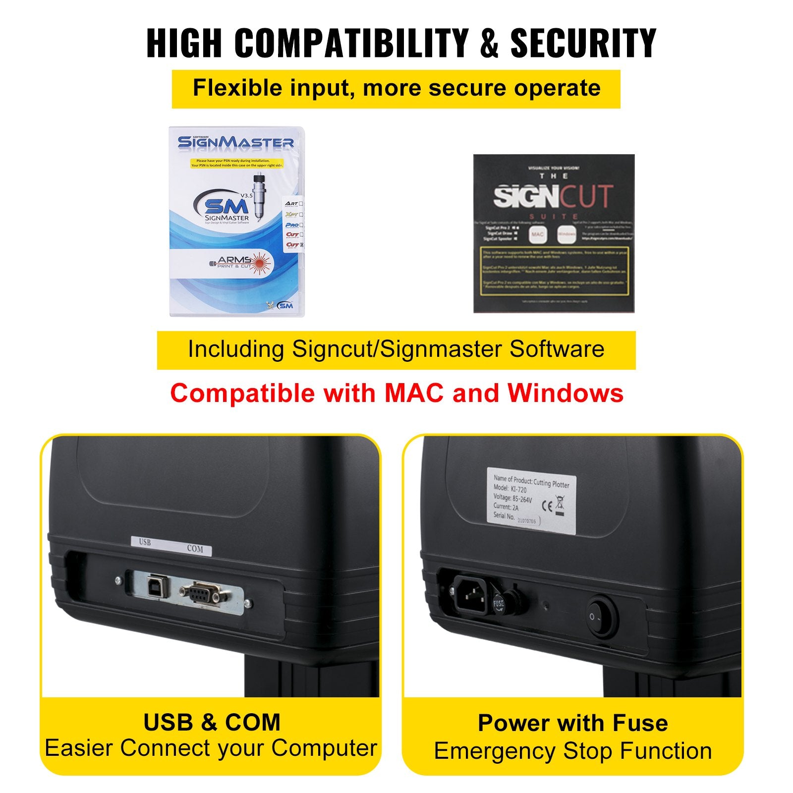 High Compatibility and Safety: This plotter cutter vinyl includes signcut and signmaster software which works with MAC and Windows via USB or serial port. It also supports other software such as graph-cut and flexi. There is power with fuse which has emergency stop function to prevent you from danger.