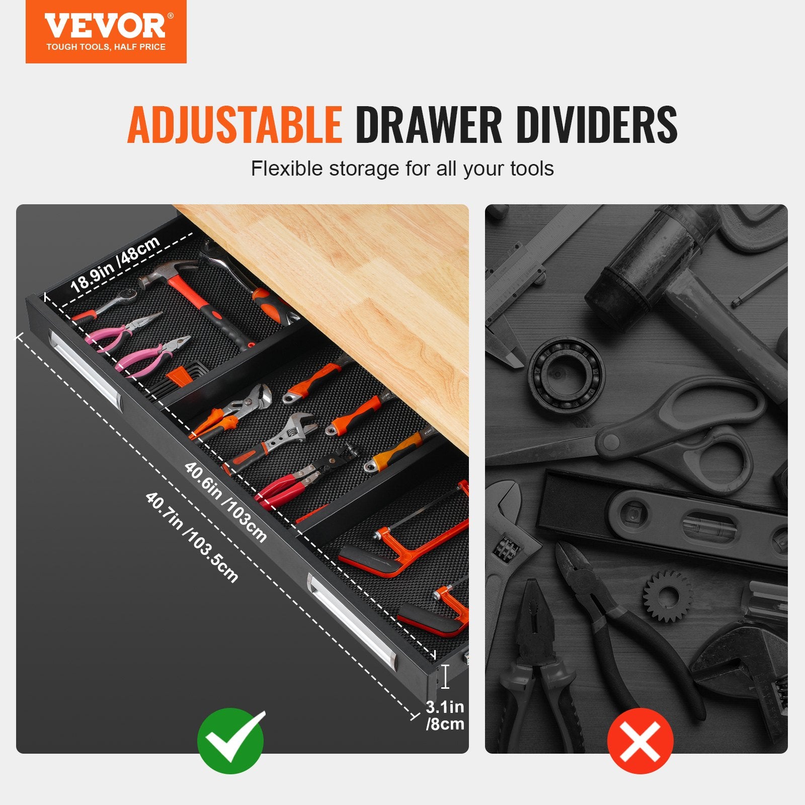 Workbench with large drawer: Thanks to a spacious drawer (flexibly adjusted through 2 dividers for ultimate tidying) with a 40.6" extended interior and 44 lbs load capacity, your screwdrivers, wrenches and more have a cozy home. It keeps tools aligned, ready for action and your space free from clutter. Work smarter, not harder!