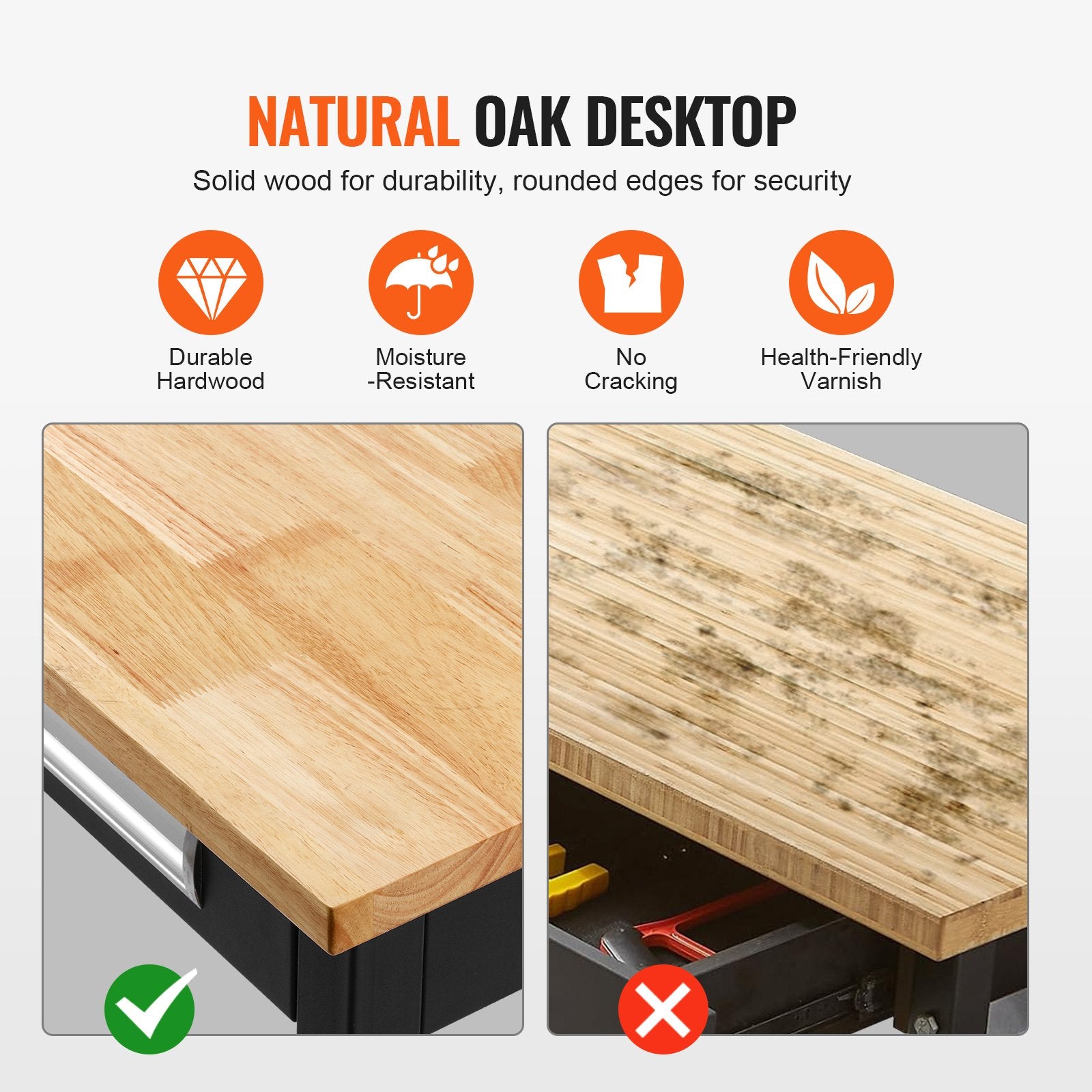 Sturdy Solid Wood Workbench: Made from 1" thick solid oak, this garage workbench is built to last. Supported by sturdy carbon steel frames, it holds up to 1500 lbs. Whether it's drilling or woodworking, this workbench adapts to all your needs.