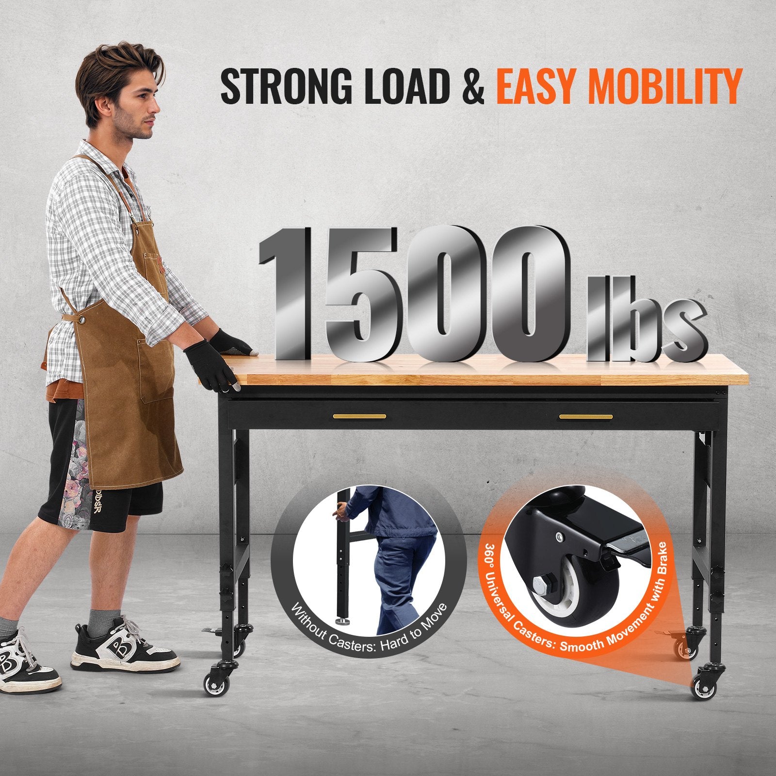 60" workbench on wheels Adjustable height table with power outlet and drawer