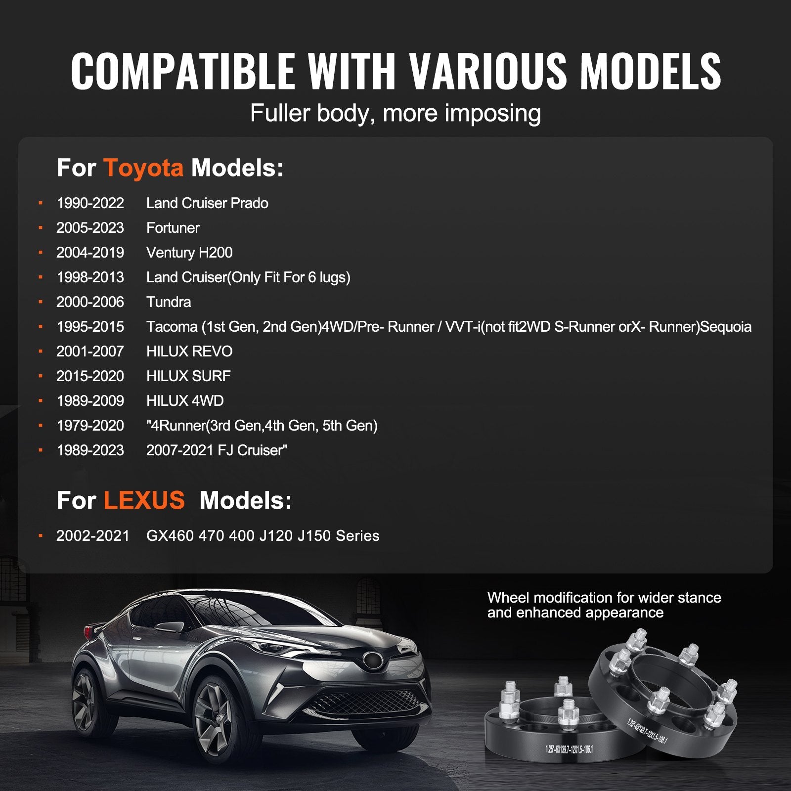 Wide Compatibility: These wheel spacers are compatible with many Toyota and Lexus vehicles from 1979 to 2023, including: Toyota: 1990-2022 Land Cruiser Prado, 2005-2023 Fortuner, 2004-2019 Ventury H200, 1998 Land Cruiser (1998-2022) 2000-2006 Tundra, 1995-2015 Tacoma (1st Gen, 2nd Gen) 4WD/Pre-Runner/VVT-i (does not fit 2WD S-Runner or X-Runner), 2001-2007 Sequoia, 2015-2020 HILUX 09 REVO, 0RF9 REVO, 0RF8 REVO 1989-2020 HILUX 4WD, 1989-2023 4Runner (3rd Gen, 4th Gen, 5th Gen), 2007-2021 FJ Cruiser. LEXUS: 2002-2021 GX460 470 400 J120 J150 series.