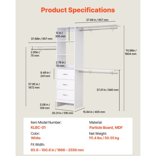 Justerbar design: Hängstången kan justeras från 575–1020 mm, och hyllorna erbjuder 5 höjdnivåer med steg om 32 mm. Inkluderar 3 utdragbara lådor för mångsidig förvaring.