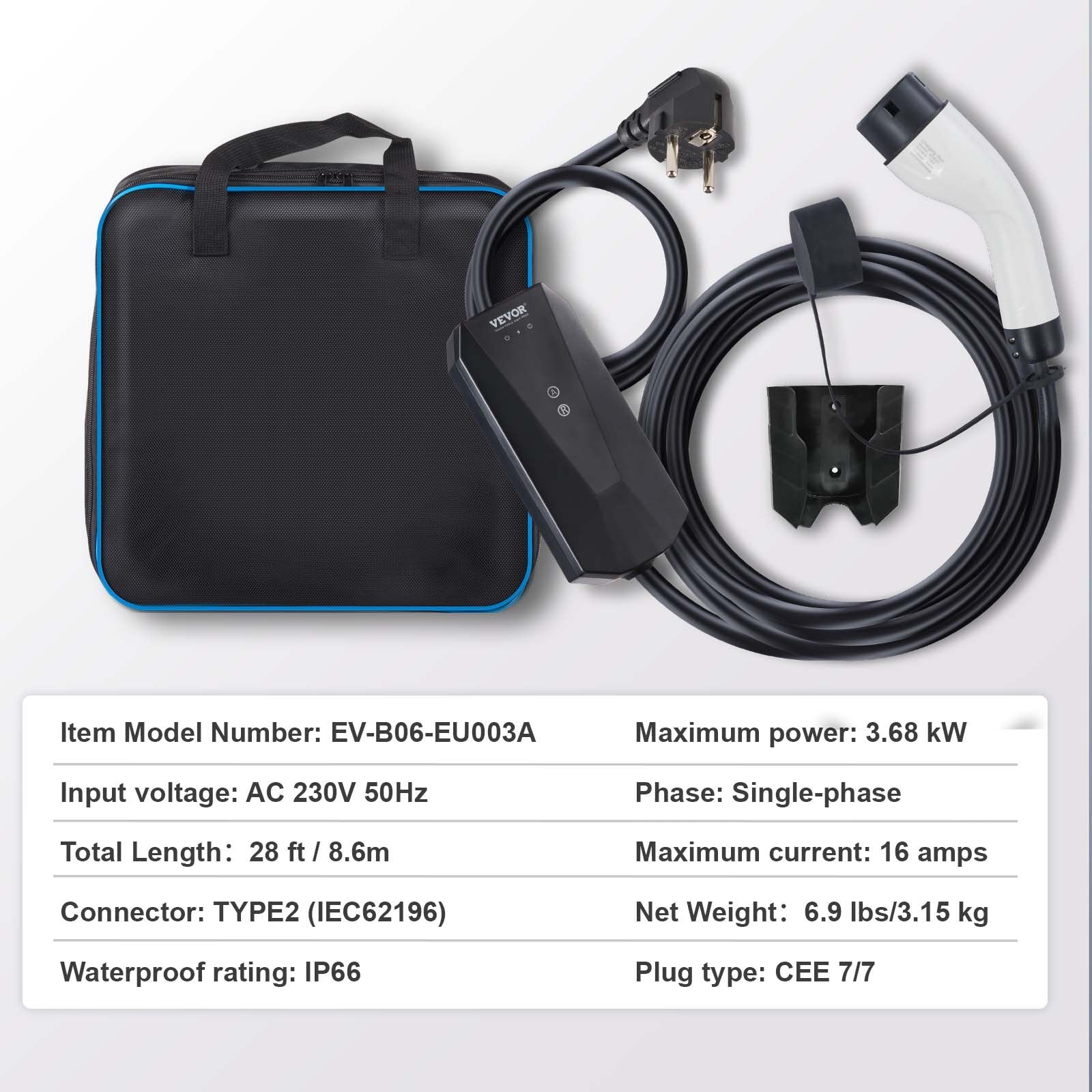 Portable EV Charger Type 2, 16A 3.7kW, Electric Car Charger with 28ft Charging Cable CEE 7/7 Plug, IEC 62196 Home EV Charging Station with Storage Bag Charging Cable Hook, IP66