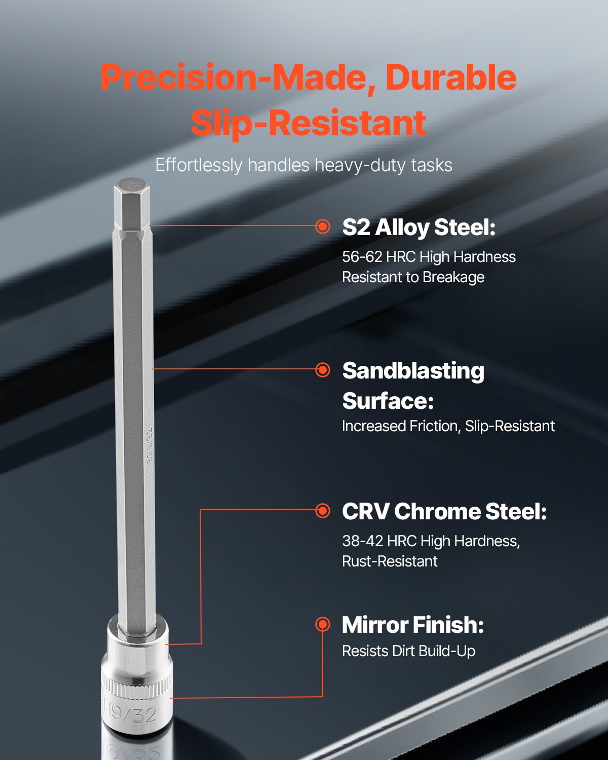 Rust-resistant and durable: Made of high-hardness S2 alloy steel and CRV chrome-plated steel, the hex socket's surfaces are sandblasted and mirror polished. This design resists breakage and corrosion, ensuring years of reliable use.