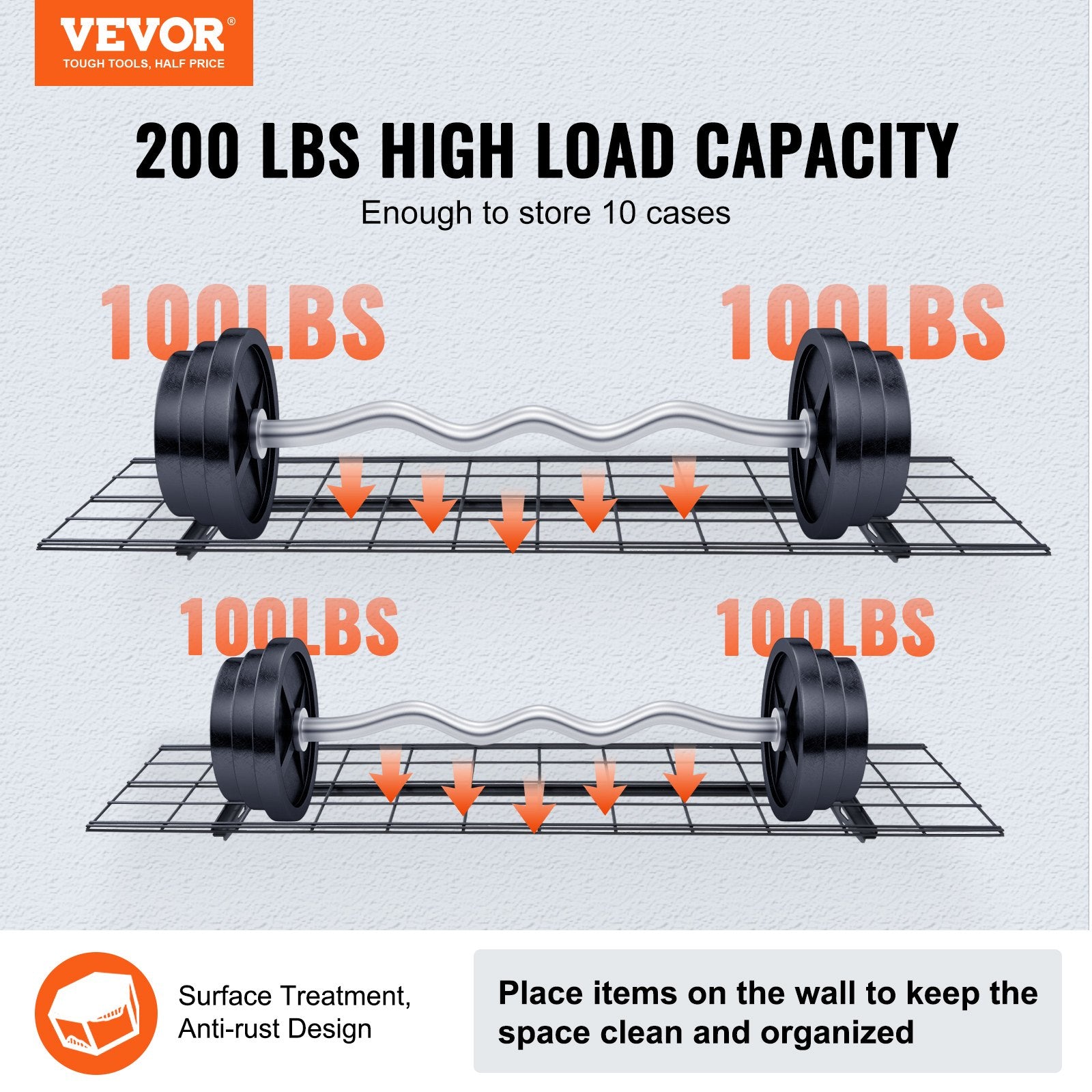200 lbs High Load Capacity: Our garage wall shelves are made of high quality metal and weigh 17.4 lbs. Each shelf has a maximum load capacity of 200 lbs, making it convenient to hang tools. Installation hole spacing: 32 inches.