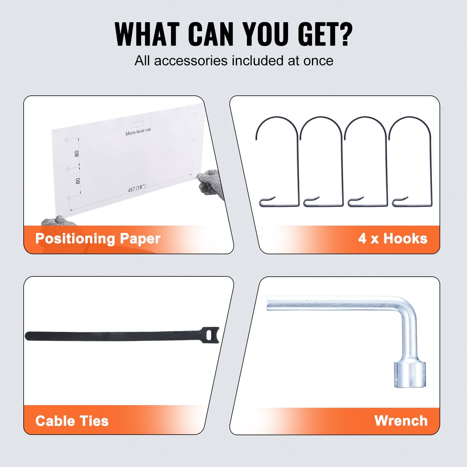 Everything you need: The package includes positioning paper, hooks, cable ties, etc. This heavy duty wall mounted garage shelf is suitable for installation on concrete or wooden walls. If it is a stud wall, please check the hole spacing and not suitable for installation on metal walls.