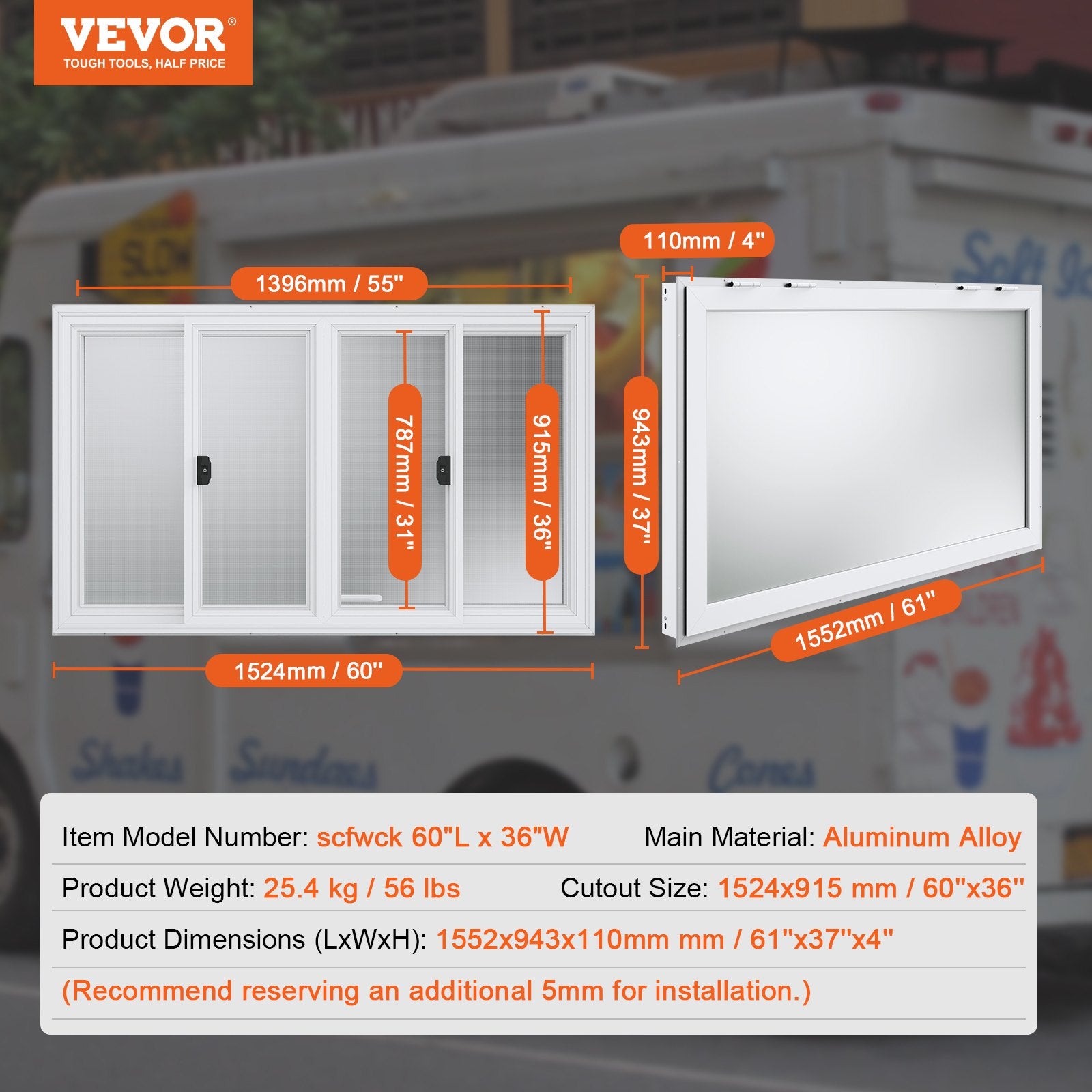 Precision Opening: The 60"L x 36"W multifunctional concession window is both aesthetically pleasing and practical, with precise dimensions and is easy to process, install or dismantle. Available in a variety of sizes, it is widely used in food trucks, concession stands, food carts, BBQ trailers, mobile food stands, etc., and is perfect for participating in food festivals.