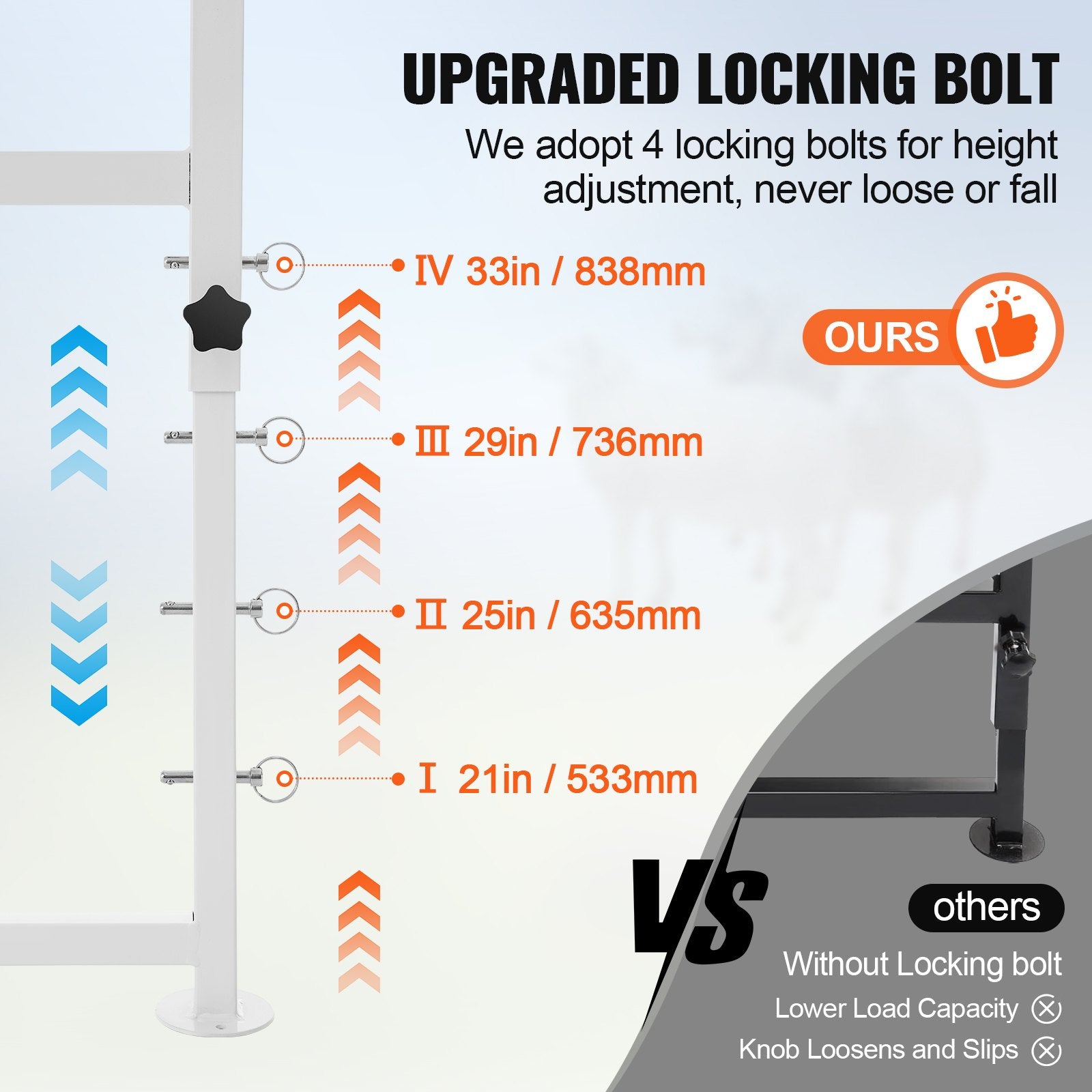 4-Level Height Adjustment: The unique pin design offers four adjustable height options, ranging from 21" to 33", catering to animals of different sizes. Reinforced posts with a triangular frame improve load capacity, ensuring safety and stability.