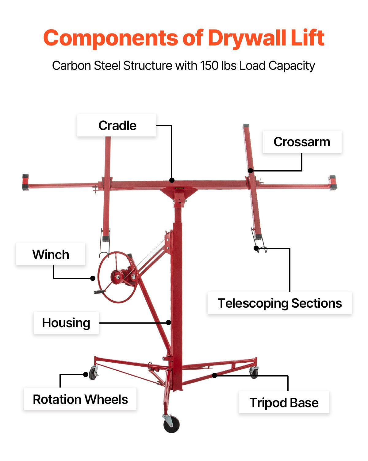 150 lbs Load Capacity: This drywall lift is made of heavy-duty carbon steel, ensuring its longevity and durability. With a maximum load of 150 lbs, this rolling drywall panel lifter is ideal for home and commercial use.