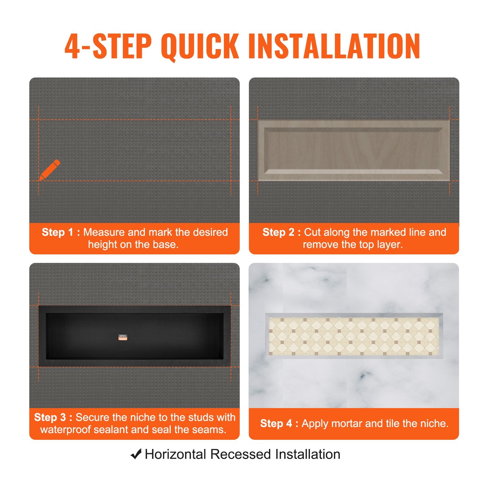Easy installation: Equipped with a free installation kit, horizontal embedded installation, you only need to follow the following steps to complete. These shower niche shelves can be installed without complicated procedures.