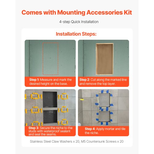 Easy installation: Comes with an accessory kit for horizontal or vertical recessed installation. Just follow these steps: Step 1: Determine the desired height and draw a horizontal line on the subfloor. Step 2: Cut along the line and remove the top subfloor. Step 3: Use waterproof joint compound to attach the niche to the joists and seal the joints. Step 4: Apply mortar and attach the selected tiles.