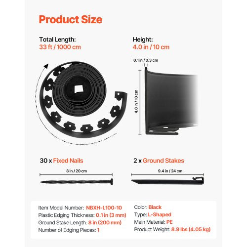 9,5 x 10 cm trädgårdskantlist: Denna 9,5 cm flexibla landskapskantlist är idealisk för medelstora gårdar, gräsmattor och trädringsrabatter. Den 10 cm höga höjden blockerar effektivt gräsrötter och håller trädgårdsgränserna prydliga.