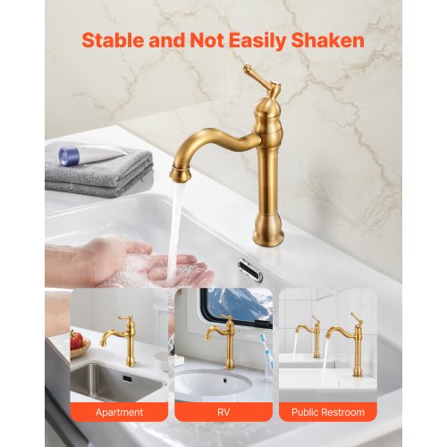 Mässingsgulddesign: Med sin båtformade design i antikmässingguld kombinerar vår handfatsblandare med ett enda grepp retroskönhet med praktiska egenskaper. Den är perfekt för att ge elegans till alla badrum eller kök, medan dess solida metallkonstruktion ger ökad styrka och hållbarhet.