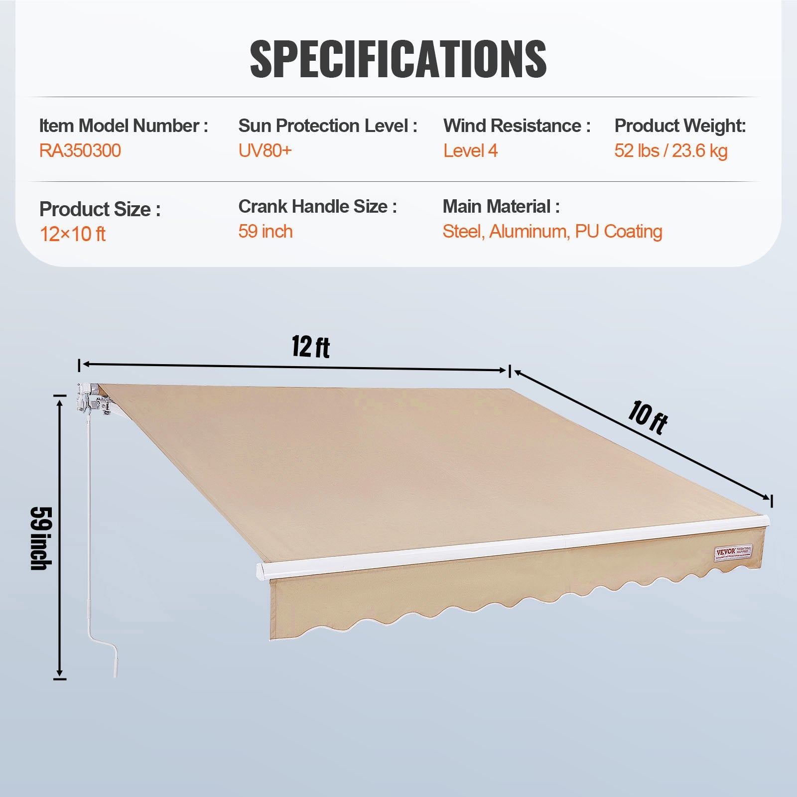 Sun protection for rain or sun: Tired of scorching summers? Our 12x10ft retractable patio awning has you covered. With a 280g polyester canopy and a waterproof PU coating, with a UV80+ rating, it protects you from UV rays and keeps you dry. It's colorfast, durable, and perfect for relaxing in your garden.