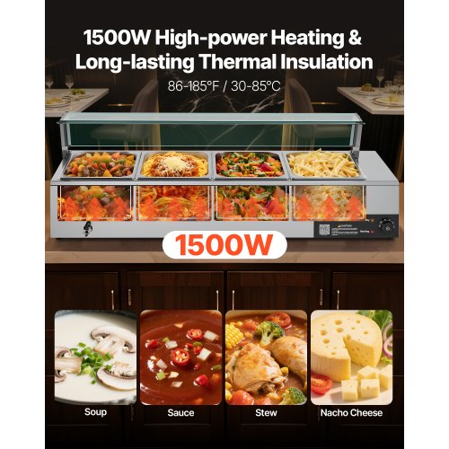 Snabb och jämn uppvärmning: Utrustad med ett starkt värmerör i rostfritt stål på 1500 W, värmer denna kommersiella matvärmare maten snabbt för att hålla smakerna fräscha. Du kan ställa in temperaturen från 30–85 °C och justera den för att passa olika rätter och serveringsbehov.