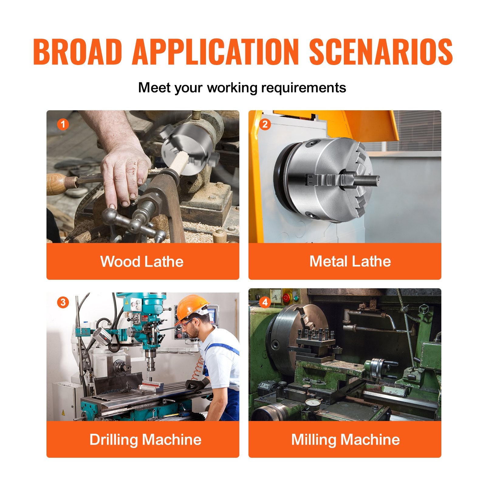 Simple and easy to use: The 3-jaw lathe chuck has a simple and compact structure, which strives for the best balance between function and reliability. The built-in self-centering function allows you to use it without repeated calibration. All you need to do is install it in the correct order and use it with peace of mind.