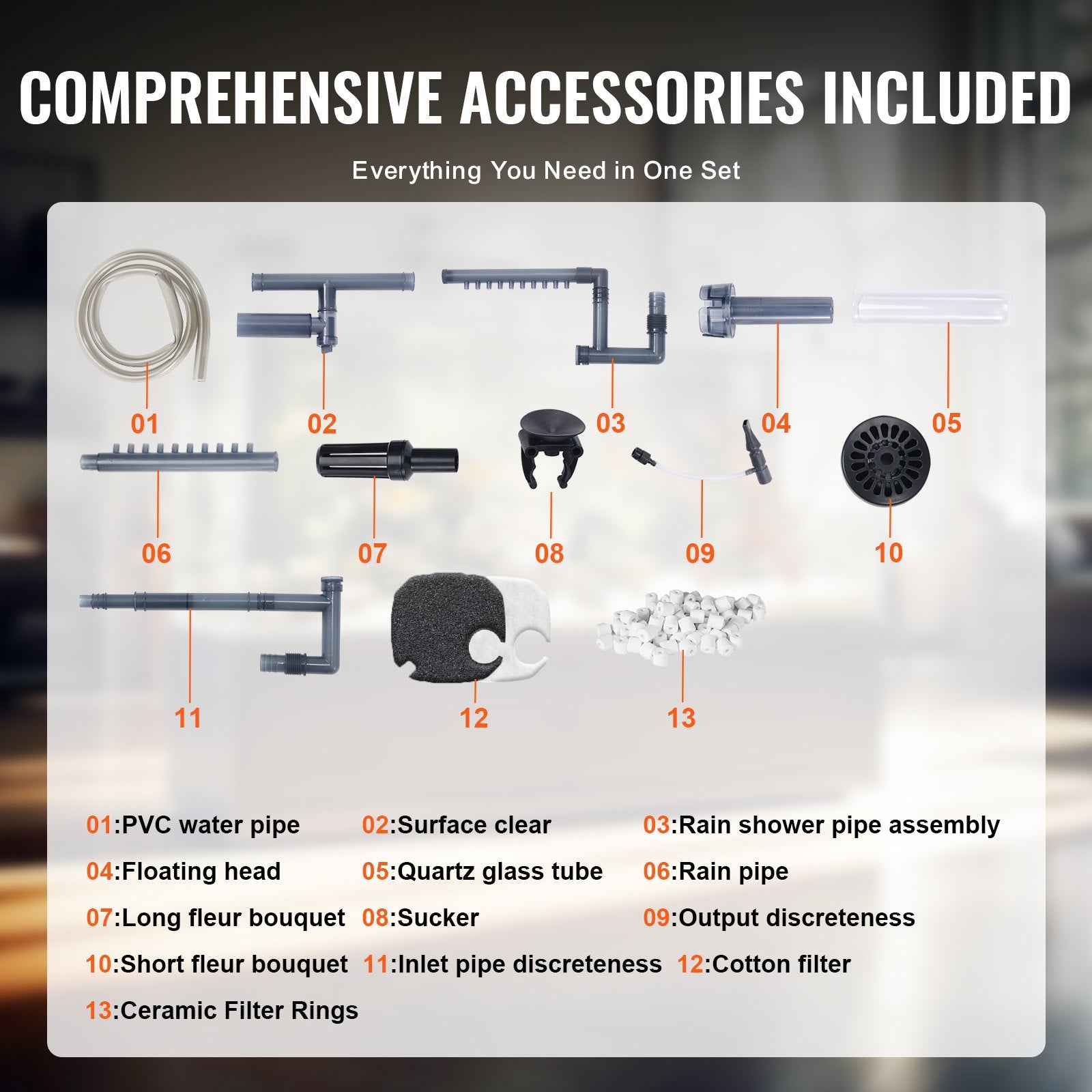 Efficient Filtration: The built-in pump has a maximum flow rate of 225GPH (850L/H) with a power of 10W, recommended for use in 55-gallon freshwater aquariums, turtle tanks and fish tanks. The water flows through the media layers to filter water and ensure a clean water condition. Each layer has a sponge to hold it in place, and it comes with ceramic rings and bio balls.