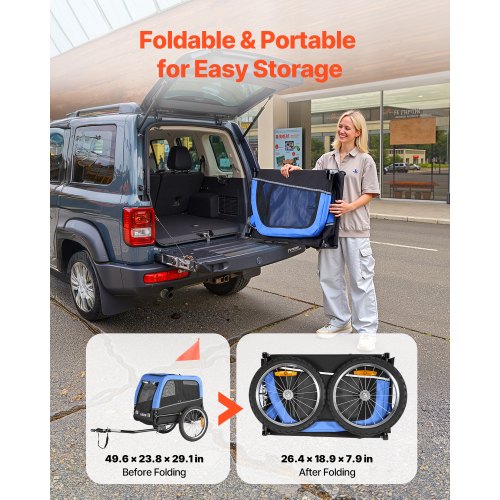 Hopfällbar ram, avtagbara hjul: Denna cykelvagn för husdjur fälls ihop på några sekunder för kompakt förvaring eller transport i bilens bagageutrymme – perfekt för resor eller daglig användning.