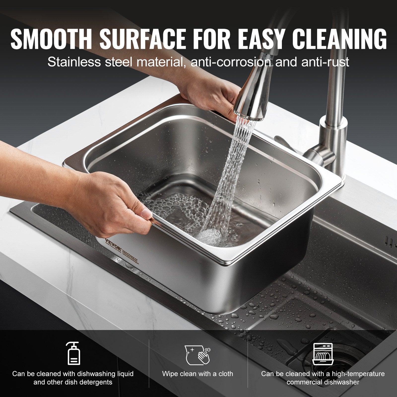 - Sturdy and Durable: Our hotel steam pan is made with 0.8mm thick stainless steel, making them sturdy, durable, and rust-resistant. The unique anti-stacking groove design enhances structural strength, making the pan more robust and easy to separate when stacked.