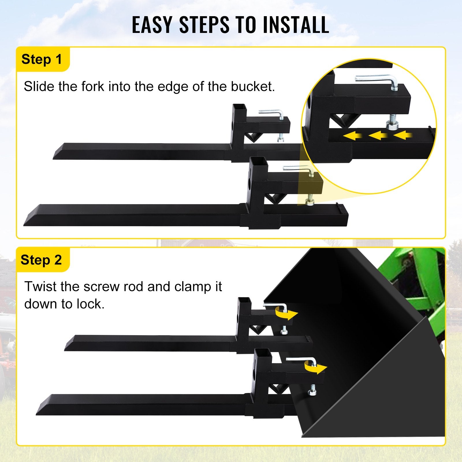 - Durable Structure: Reliable welded steel adopted by our clamp-on bucket forks is rust-resistant. The powder-coated finish also improves better rust resistance, durability, and longevity. Thick and rectangular tube walls add stability.