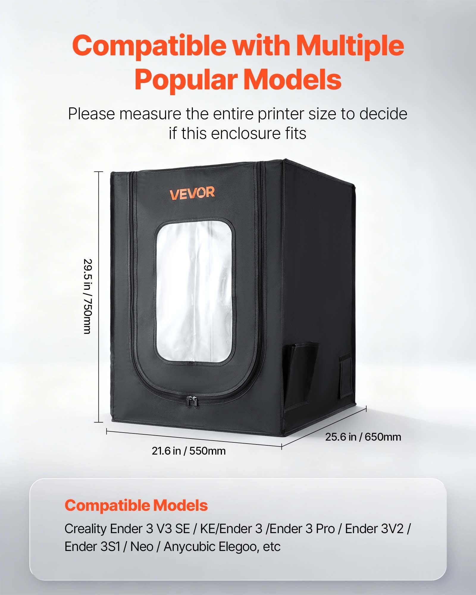- Wide Compatibility: Measuring 21.6 x 25.6 x 29.5 in, our 3D printer tent easily accommodates Creality Ender 3 V3 SE/KE/Ender 3/Ender 3 Pro/Ender 3V2/Ender 3S1/Neo/Anycubic Elegoo, etc. Please measure your printer before ordering to ensure compatibility