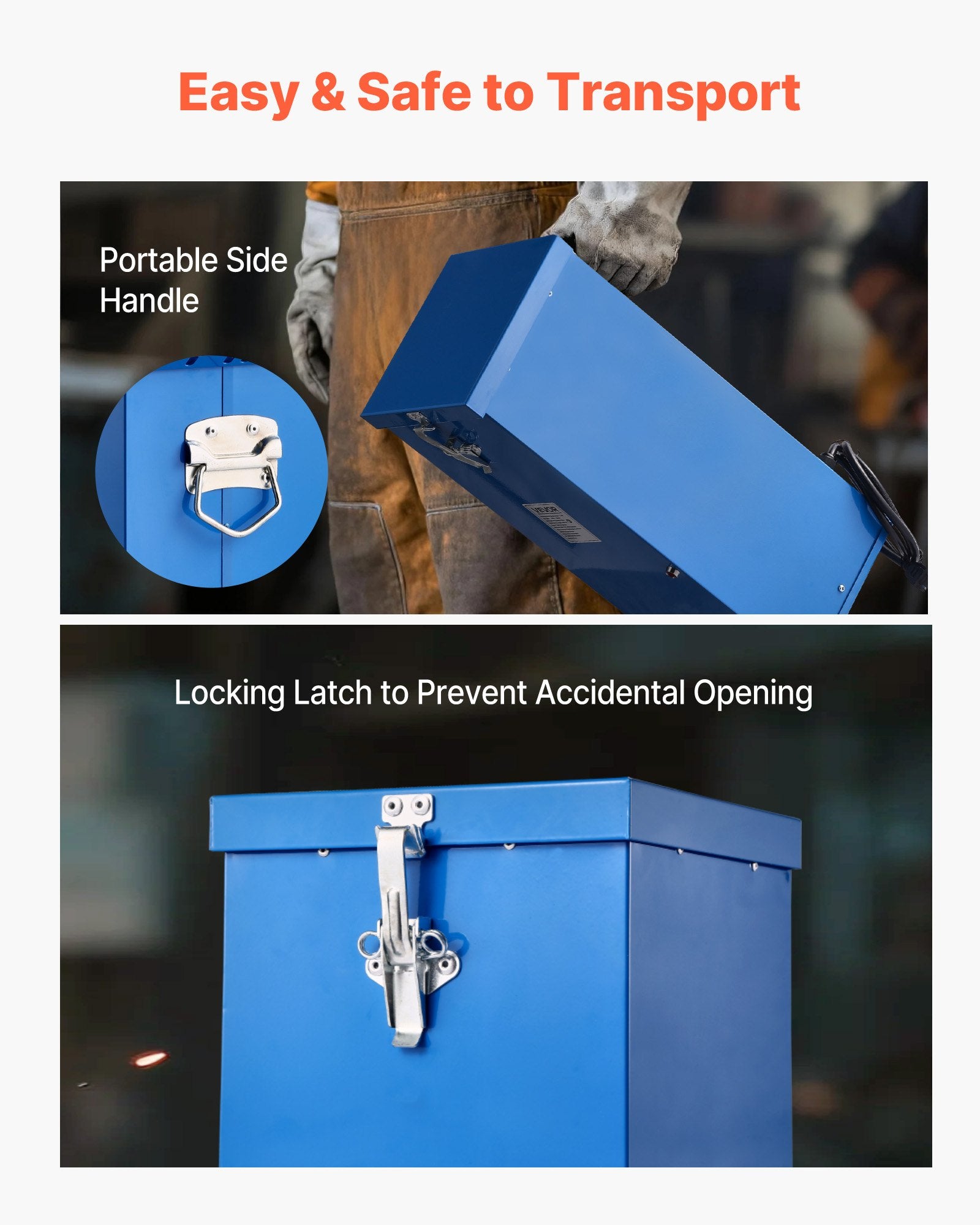 - Safe and Easy Carrying: The welding rods drying oven features a large side handle and top handle, making it easy to transport securely to the worksite. Its locking latch design prevents accidental openings, enhancing overall safety during operation