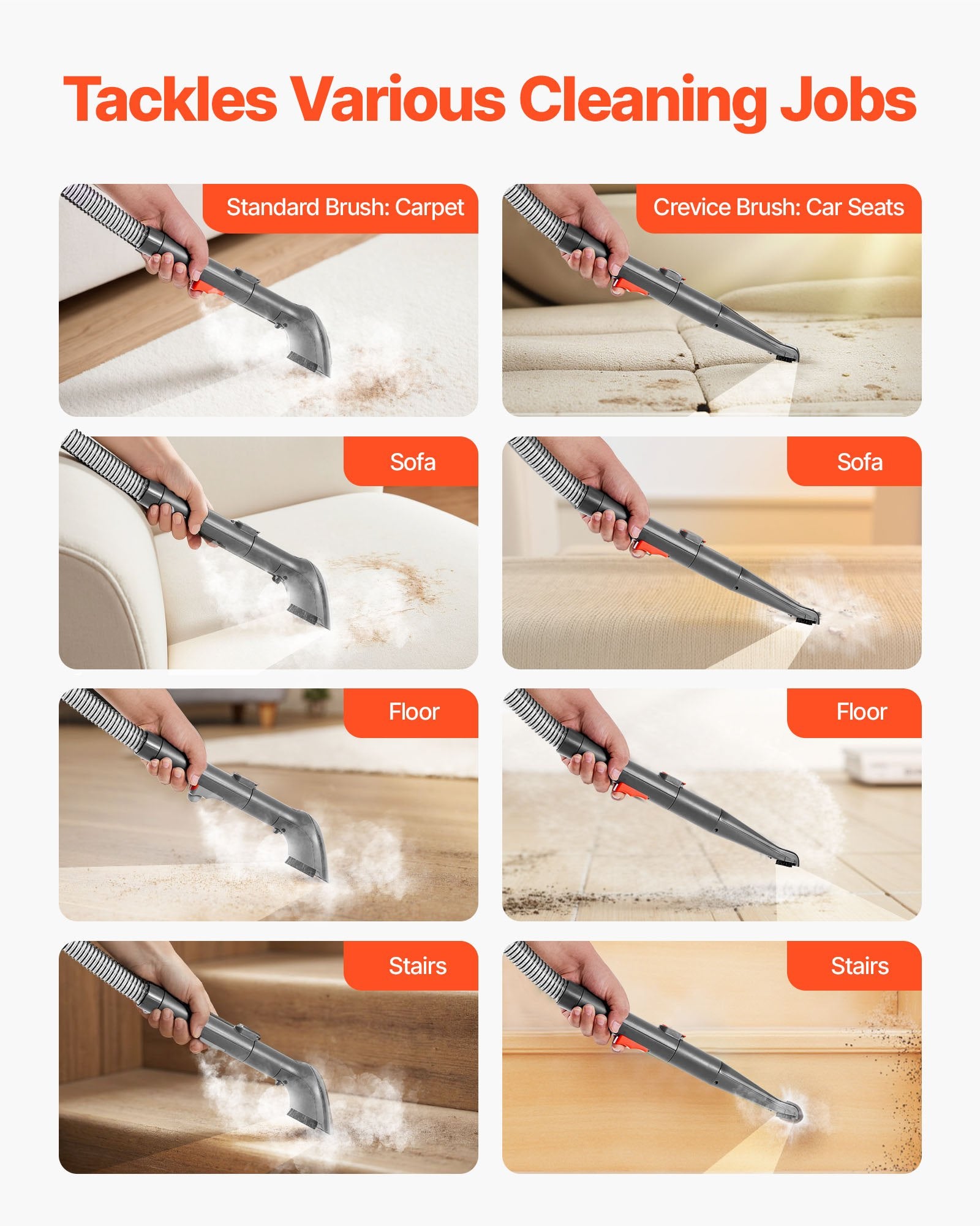 - Efficient Cleaning: Our carpet cleaner machine features a 16.4 ft power cord and 5.41 ft flexible hose for full-room coverage, eliminating repositioning and outlet hunting; includes carpet brush (brush-suction combo for coffee/jam stains) and crevice tool (for furniture gaps) for complete home cleaning