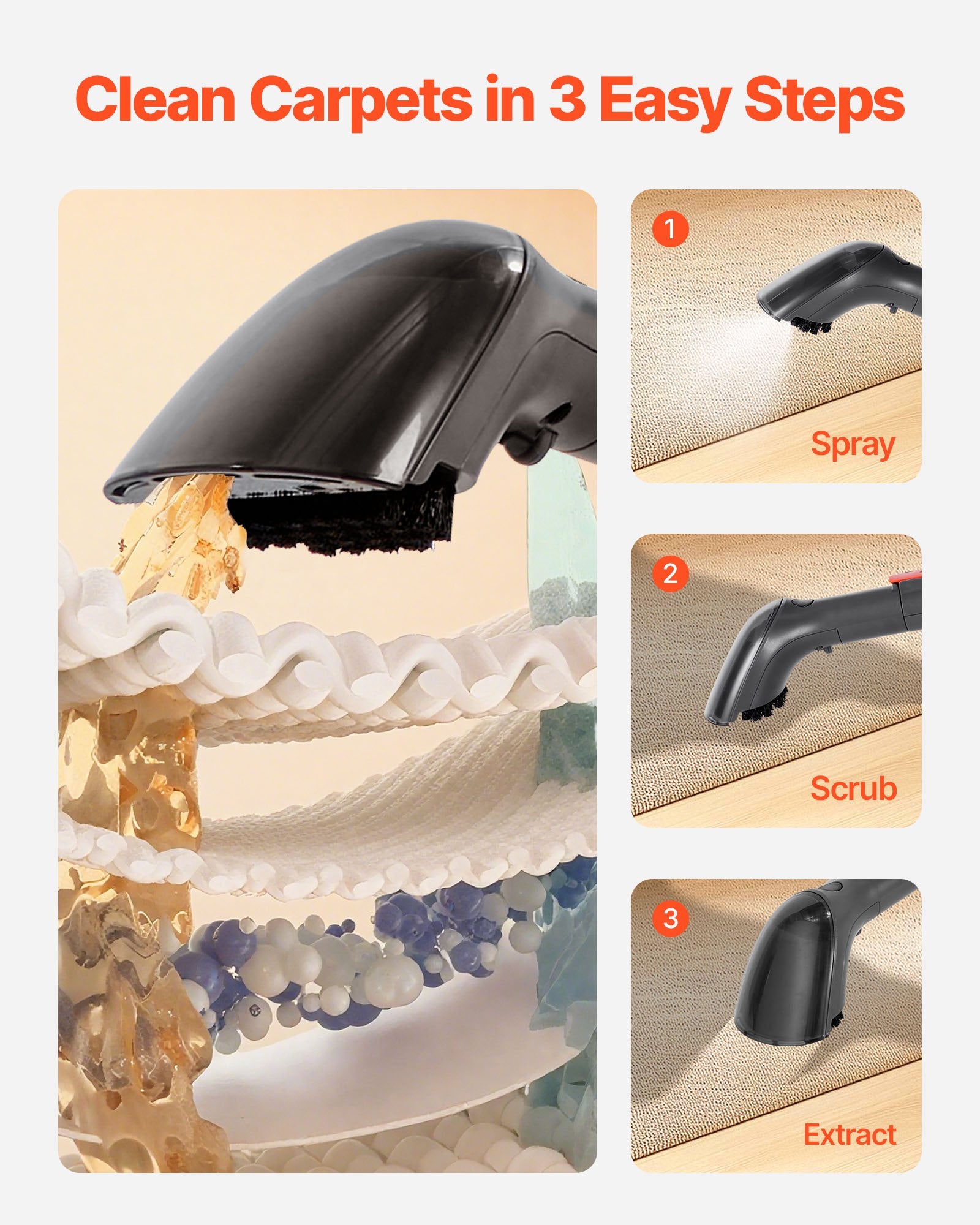 - Effortless Operation: This portable upholstery cleaner machine simplifies cleaning in 3 steps—Spray, Scrub, Suction—restoring carpets to like-new condition anywhere