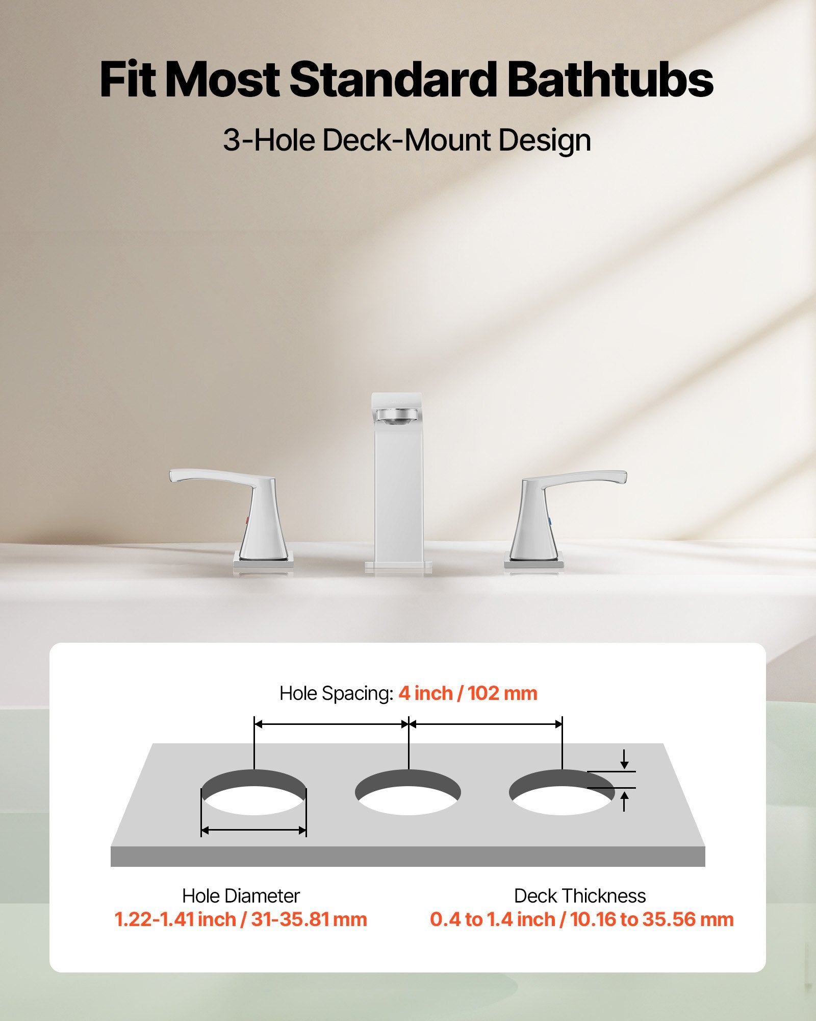 - Universal 3-Hole Design: This widespread roman tub faucet includes a 3-hole mounting design that fits the majority of bathtubs. Hole sizes range from 1.22 to 1.41 inches (31 to 35.81 mm), with deck thickness between 0.4 and 1.4 inches (10.16 to 35.56 mm), making installation straightforward and reliable