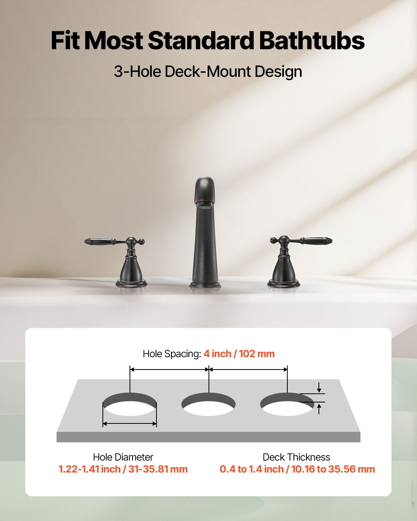 - Universal 3-Hole Design: Featuring a 3-hole deck mount, this widespread roman tub faucet fits most bathtubs easily. Installation holes range from 1.22 to 1.41 inches (31 to 35.81 mm) in diameter, and the deck thickness is supported from 0.4 to 1.4 inches (10.16 to 35.56 mm), offering a secure and versatile installation